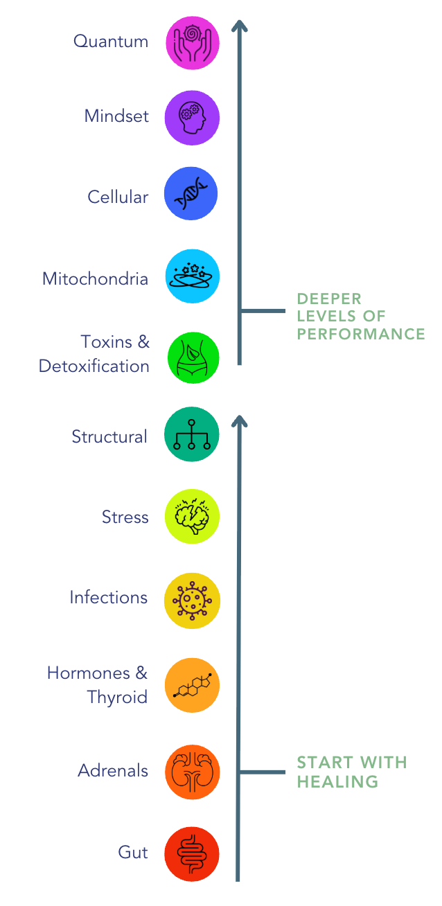 We begin with the essential systems that must be stabilized first, like the gut, adrenals, hormones, and immune response. This sets the stage for deeper healing.
